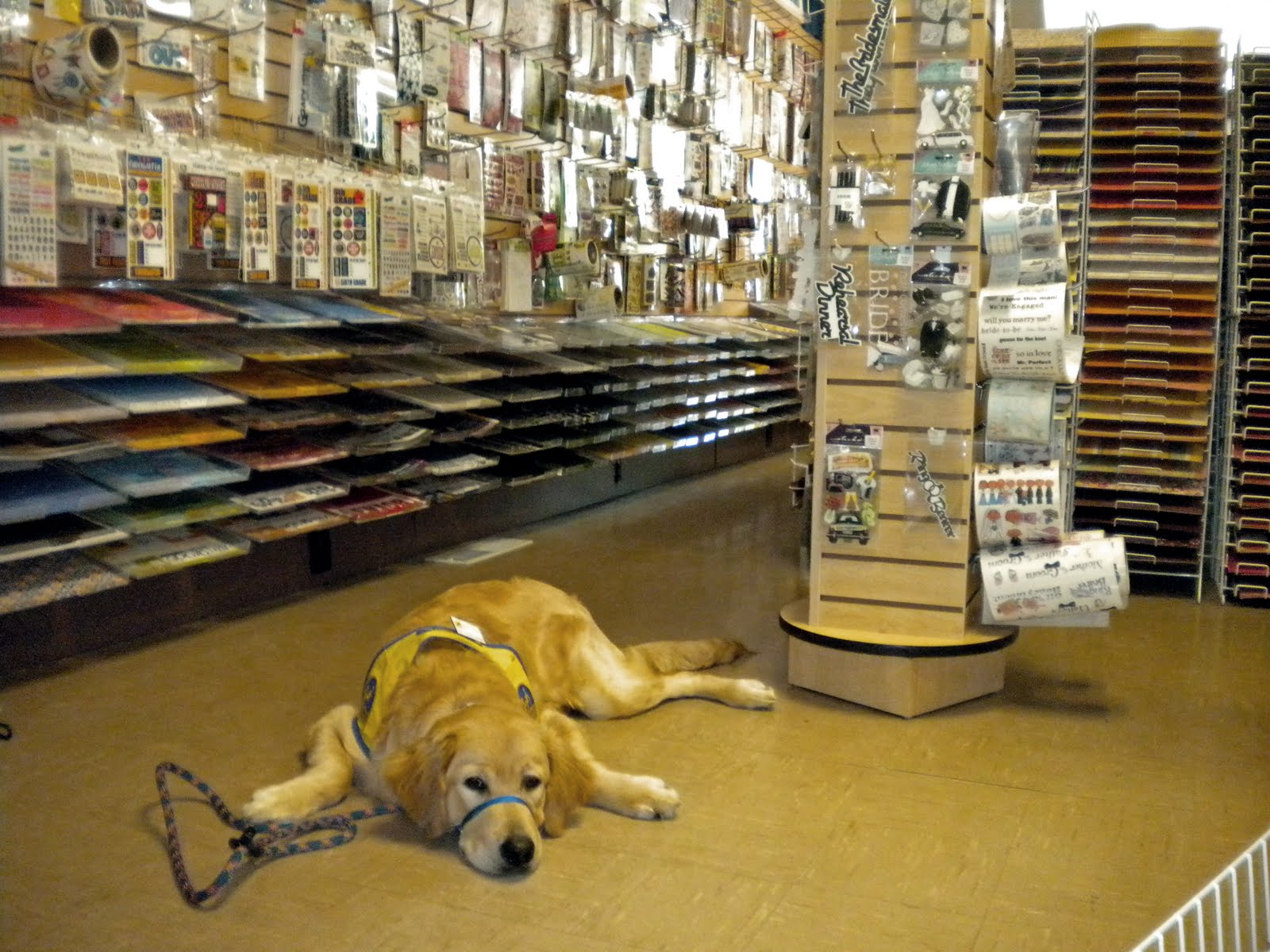 Lunch hour on Wednesday was a trip to the scrapbook store with my croppin’ buddy, Renee.  Here’s Micron doing a wonderful down-stay while we shopped. No, I don’t think he looks depressed about being there.