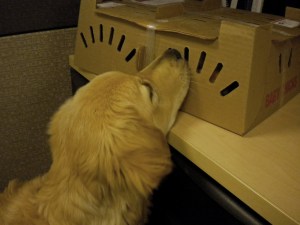 This next shot is Micron trying to get his head around why that box is making such a racket. It’s a box o’chicks. Fifty chicks, so I was told. Noisy little buggers.