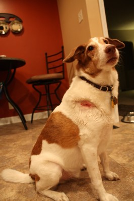 This week’s Wordless Wednesday post is in honor of Jager and the terrier lobe inside that pointy head of his.  An emergency trip to the vet to get four staples in his shoulder a couple of days ago. Our guess? That ballsy cat that teases him can fit nicely through the farm fencing in the backyard, but Jager can’t. When he gets to running, he can break the terrier sound barrier. Goober dog.