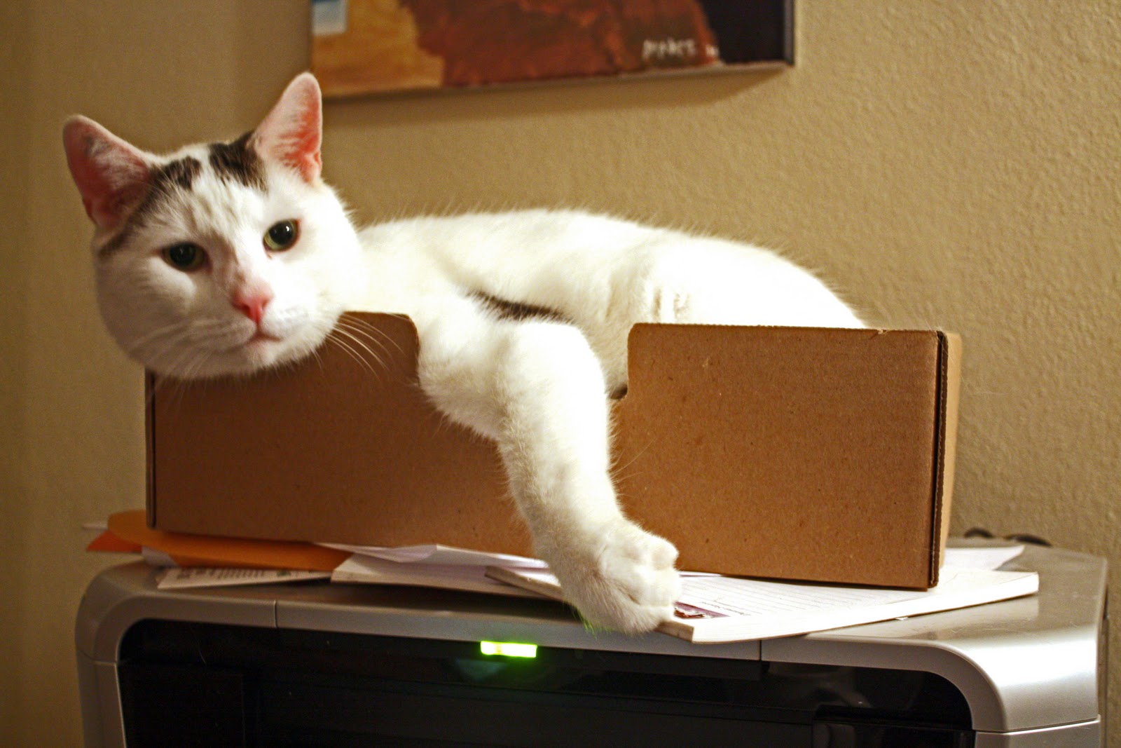No longer the place I was going to store those old CD’s. Instead that cardboard box I was saving was commandeered by the cat. And setting the thing on the printer keeps those privileged feline nether regions nice and toasty warm. Energy savings in one little corrogated package.