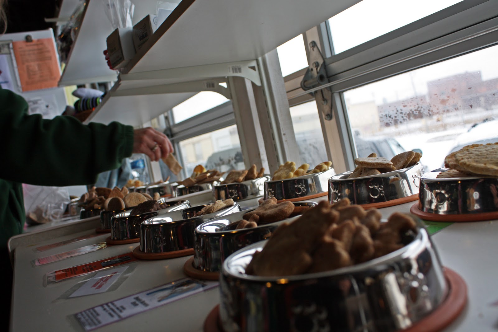 We made time to stop at the Animal Snackers Bakery, a shop run by the volunteer group Friends of the Humane Society.  These folk make healthy and tasty dog cookies as fundraising for the Humane Society of Greater Dayton. I stop by here every trip to the market to grab some baked goods to support the fine work these volunteers do. And because the dogs love it when I bring home some goodies for them. They nosh upon all of the varieties with eagerness, but it does seem their favorite is the peanut butter Dog Frogs.  How can I tell? I measure the drool strings.