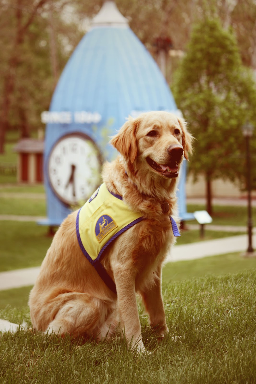 The weekend before matriculation, we visited Dayton’s historical Carillon Park for a final photo shoot of Micron in his yellow training cape. Here’s a never before published photo from the Black-Sword photo archives. Our handsome yeller dog is posing in front of a landmark that may be familiar to many a Gem City native.