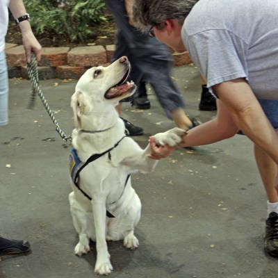 Here’s Oneida who is working a little harder than the pups. Here’s how to properly greet people, young ones. Pay attention now, she says. A fully trained assistance dog, she shows her stuff by engaging folk with adorable hand shakes.