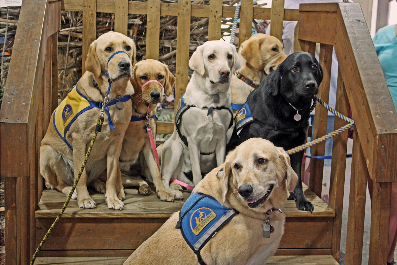 Let’s use the photo below as a fer instance. We’re at the Ohio State Fair this weekend raising awareness of CCI at our meet-and-greet booth. Good for CCI and some great socialization training for our pups. These furries are different ages, even varying shades of yellow, but we’ll look deeper into appearances than that.