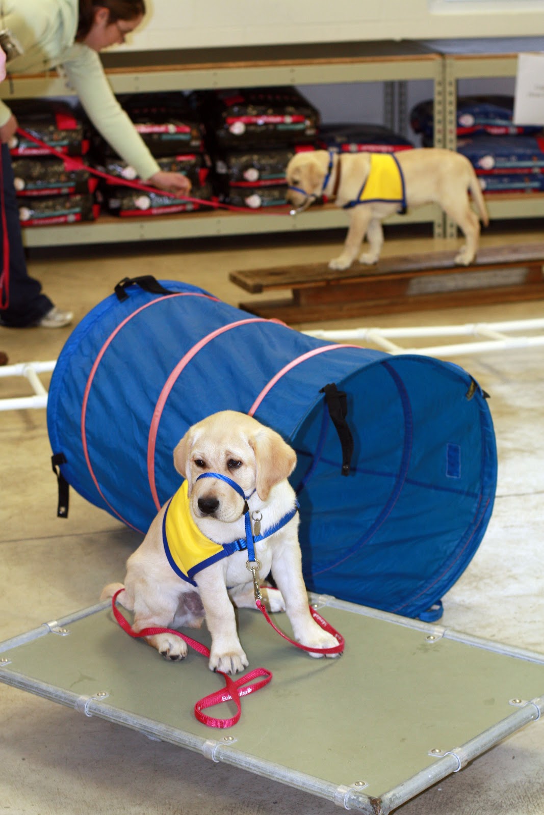 On the left is Everett looking rather confident after stepping up and onto a novel surface. In the background is Ella on the balance beam following the lead of her puppy raiser, Maggie.
