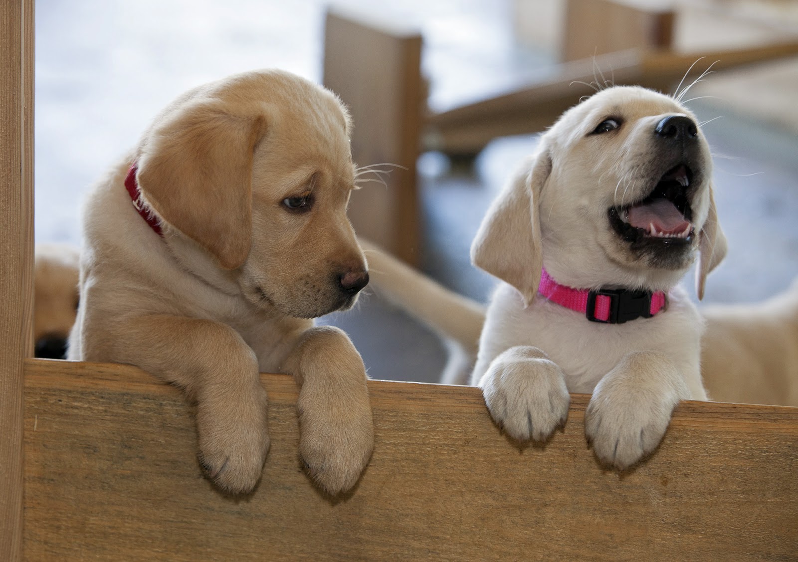 The lovely Emma and Euka are six weeks old in this archival photo from their Canine Companions for Independence volunteer breeder caretaker.
