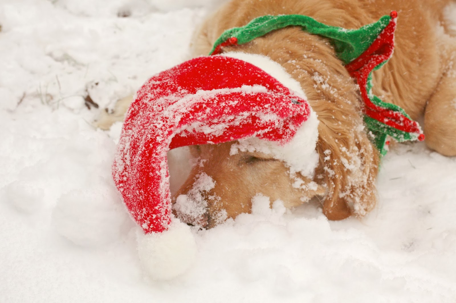 Love the pictures! And the snow just makes it. I esp. like the one with curly elf cap and the very last one of the dogs playing tug with their Christmas gear. excellent!