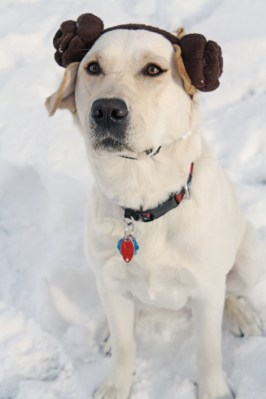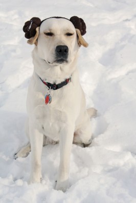 So anyway, Hoth. We messed around for a few minutes trying to scare up a white towel or blanket or something to drape over the princess’s shoulders to give her an Episode 4 Leia wardrobe. Then realized our pale beauty can pull off the look sans the good linens. Sure, like I’d have anything white around here anyway.