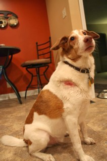 After Jager calms down and I get most of the blood cleaned off, I still don’t see anything overt. I know I’ll feel better having the vet look him over anyway, so against the vigorous protestations of the spotted dog we make a morning appointment.