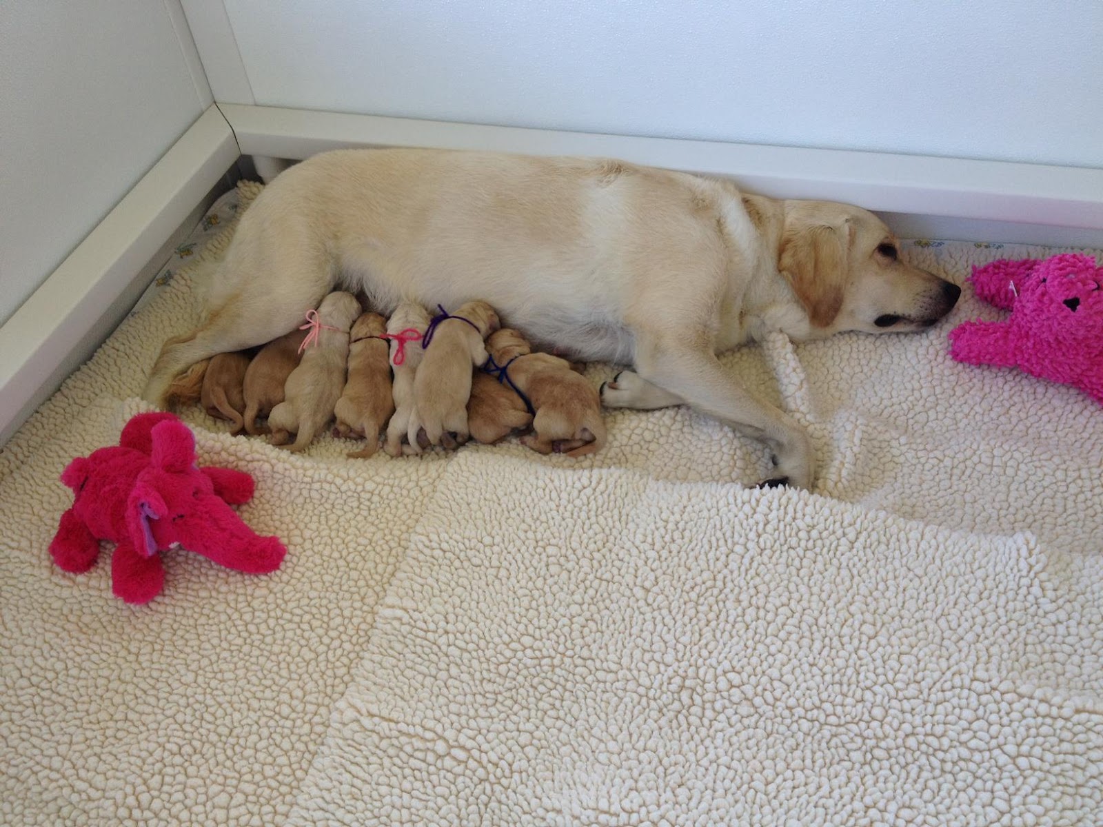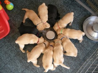 Eight little yellow cottonballs, five girls and three boys. All ridiculously precious little packages in downy puppy fur.