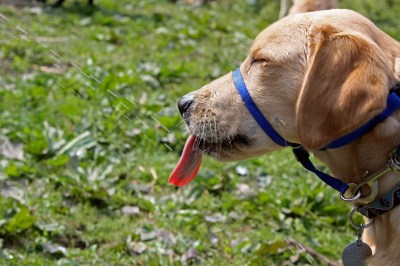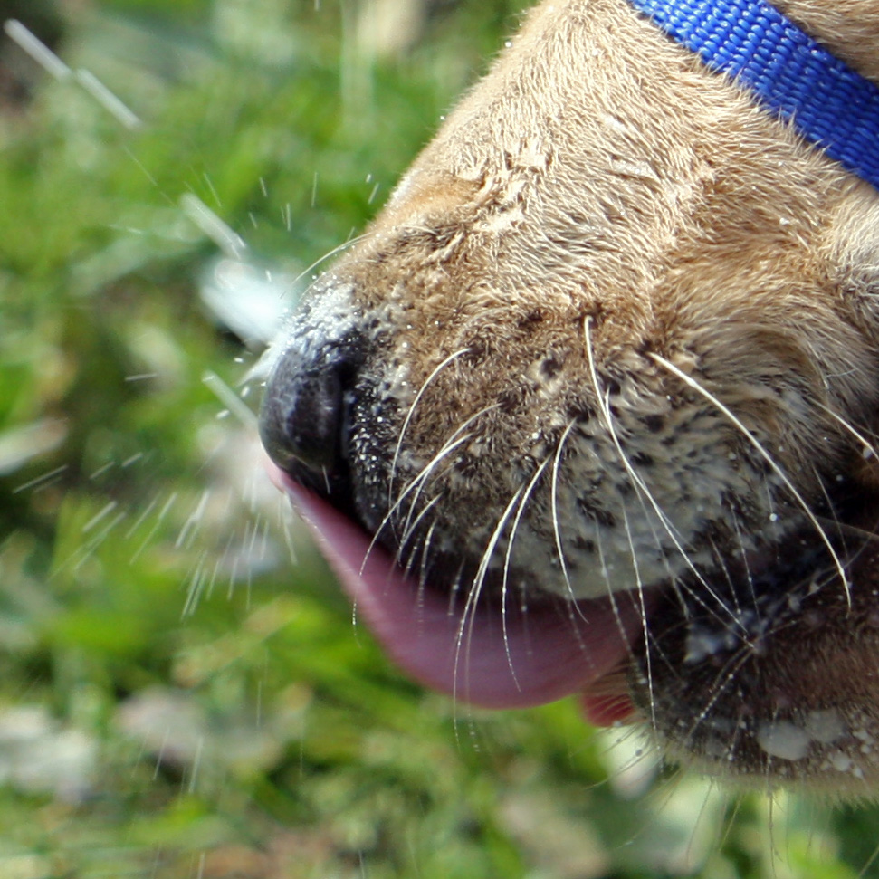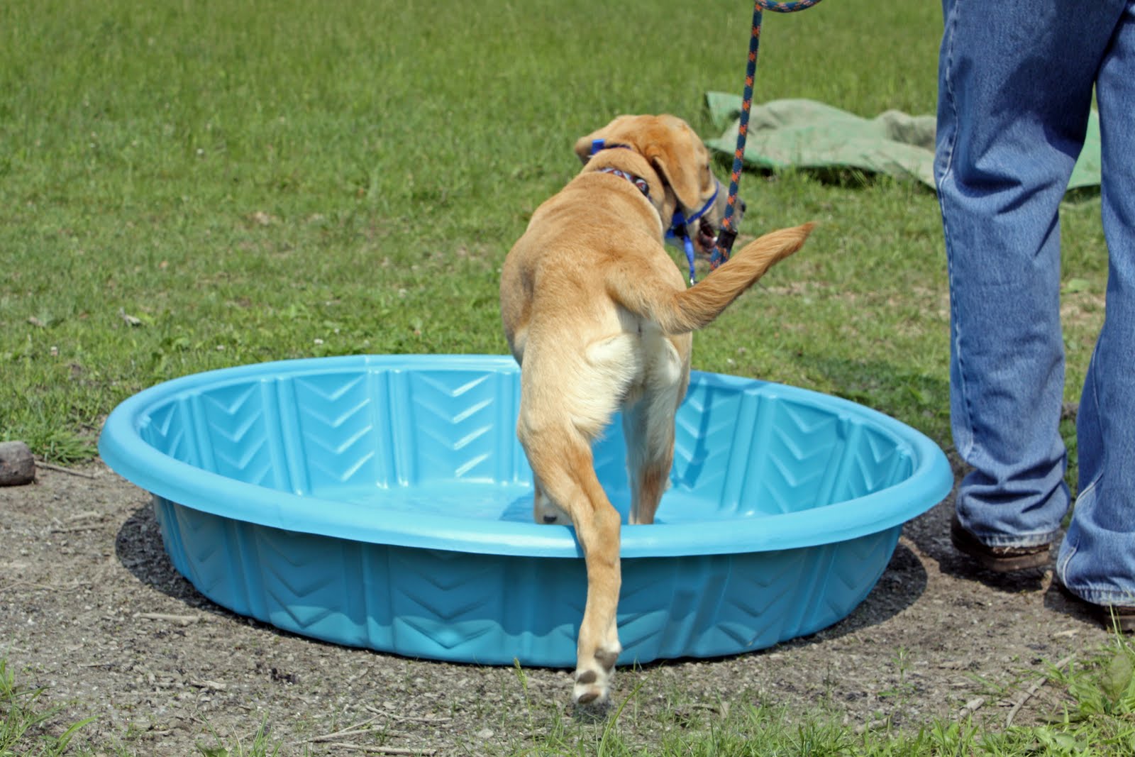 Now for the weird surface of the wading pool. No problems here. We also want the pup to be able to perform a Sit and Down on these new surfaces. Which Yax did do, but I can’t post the photo of the Down since he took the opportunity to roll onto his back to look like some kind of furry dead lizard baking in the sun.