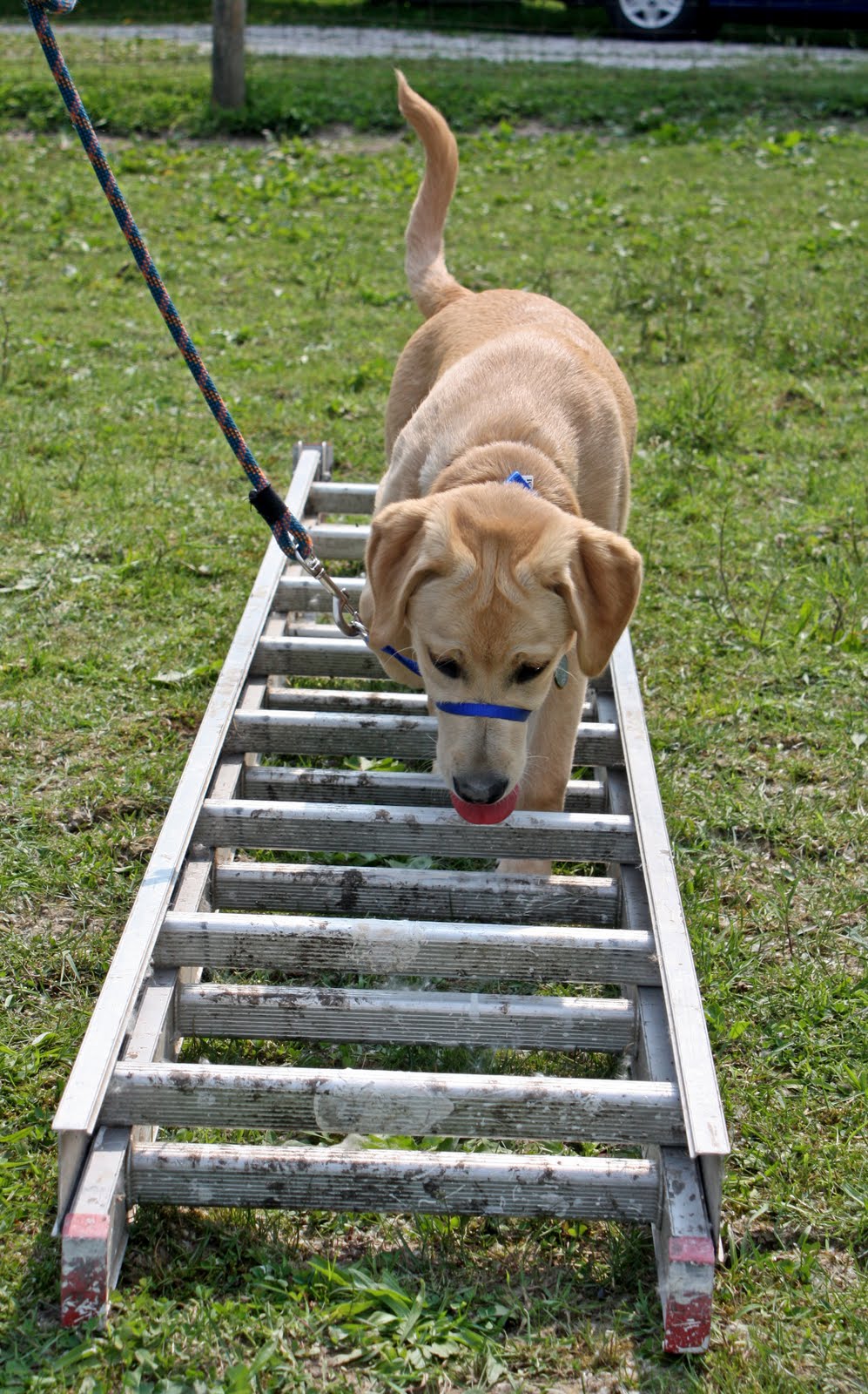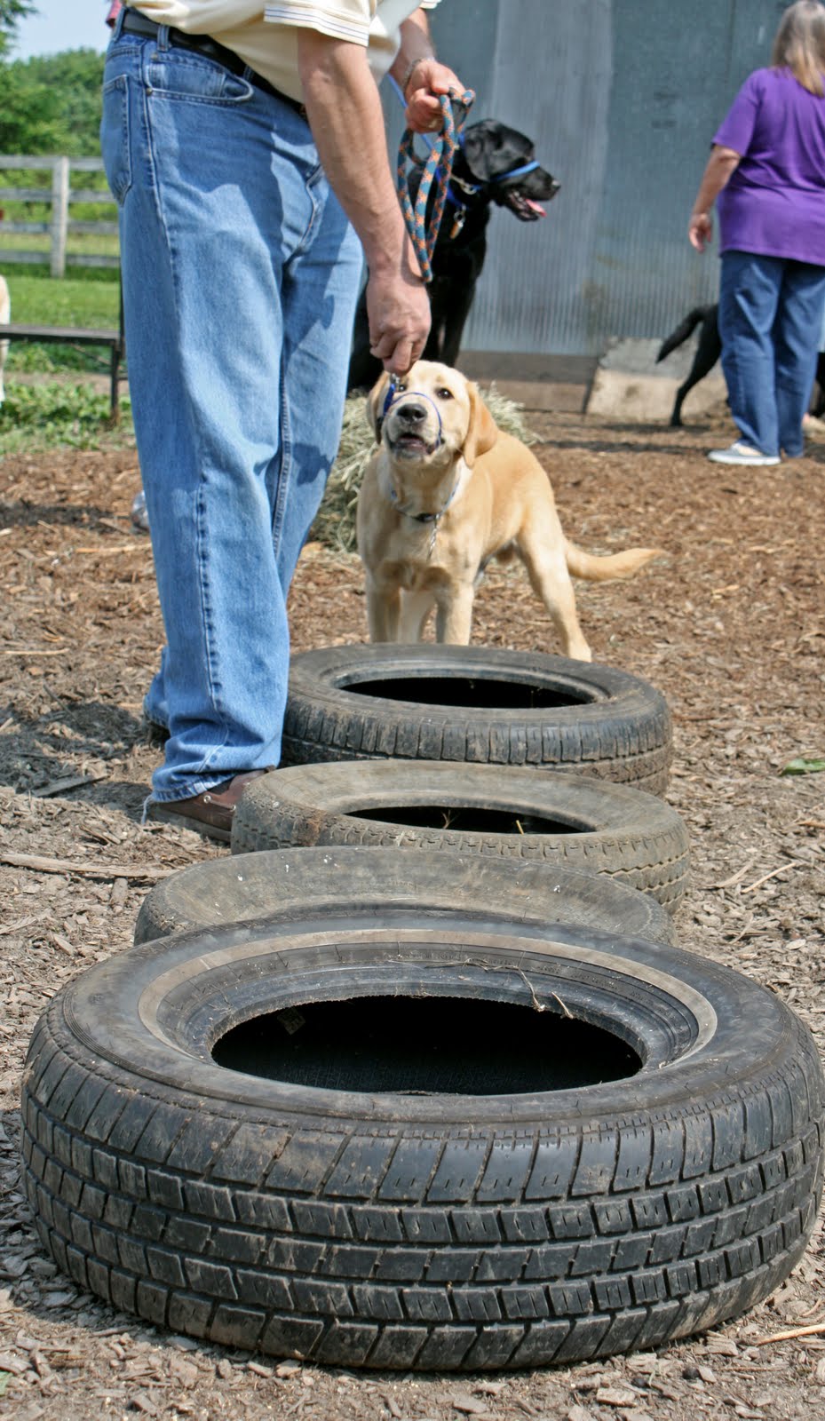 Our first station was at the tires. The point was to simply walk through and move on. Yax had some trouble getting his head around this one. A little gentle coaxing with a dog biscuit from co-puppy raiser and then me putting down the camera and stuffing his body into the first tire was all it took. Once sitting inside the tire, he realized it was not indeed a Pit of Doom and found a reasonable comfort level. Ok then, let’s move on to the ladder station.