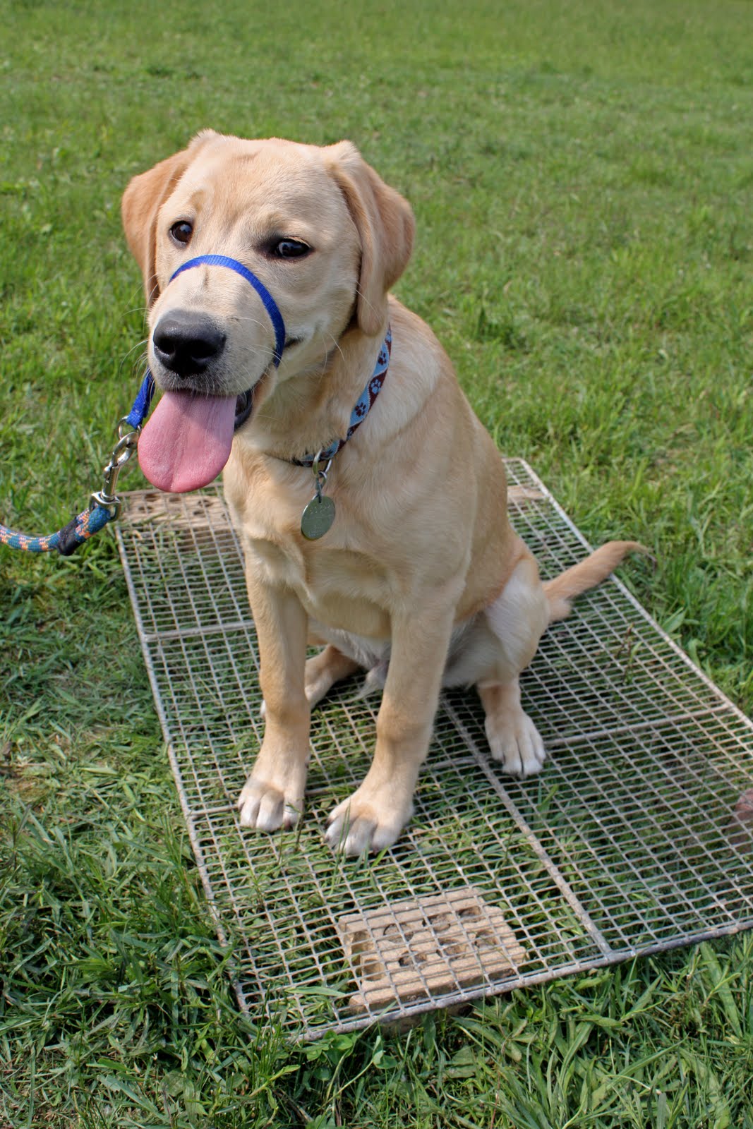Almost done. Now for the crate surface. A walk across, with another Sit and Down. A pro, he is. Well done, yellow dog.