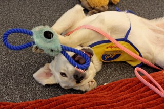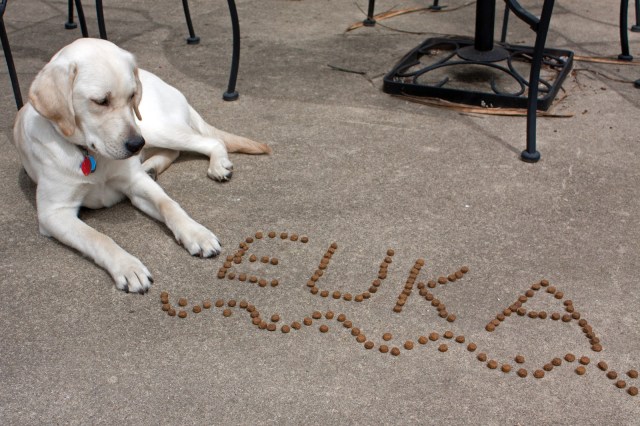 Sit, Euka. Holy cow, she does. Huh. Well, this is going quite well. This is Euka, I say. She’s a puppy in training to . . . Ack! Euka! Off!