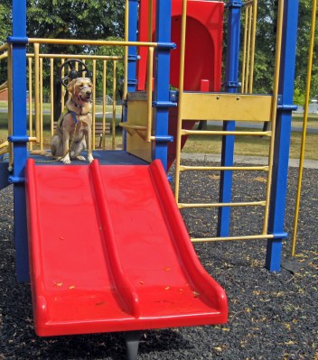 We clear the deck chair of the distraction of now rastlin’ puppies and give Euka her chance to explore. And the usually fearless Euka surprised us by needing some encouragement. We tried with a dog cookie a couple of times, but it wasn’t until Everett came tearing back up the slide (Comin’ through! he yells) that she found her motivation. Yep, the spirit of competition. With Everett standing at the top, wagging his tail, Euka looks at him with a Like heck you are expression and charges to the top to pound him.