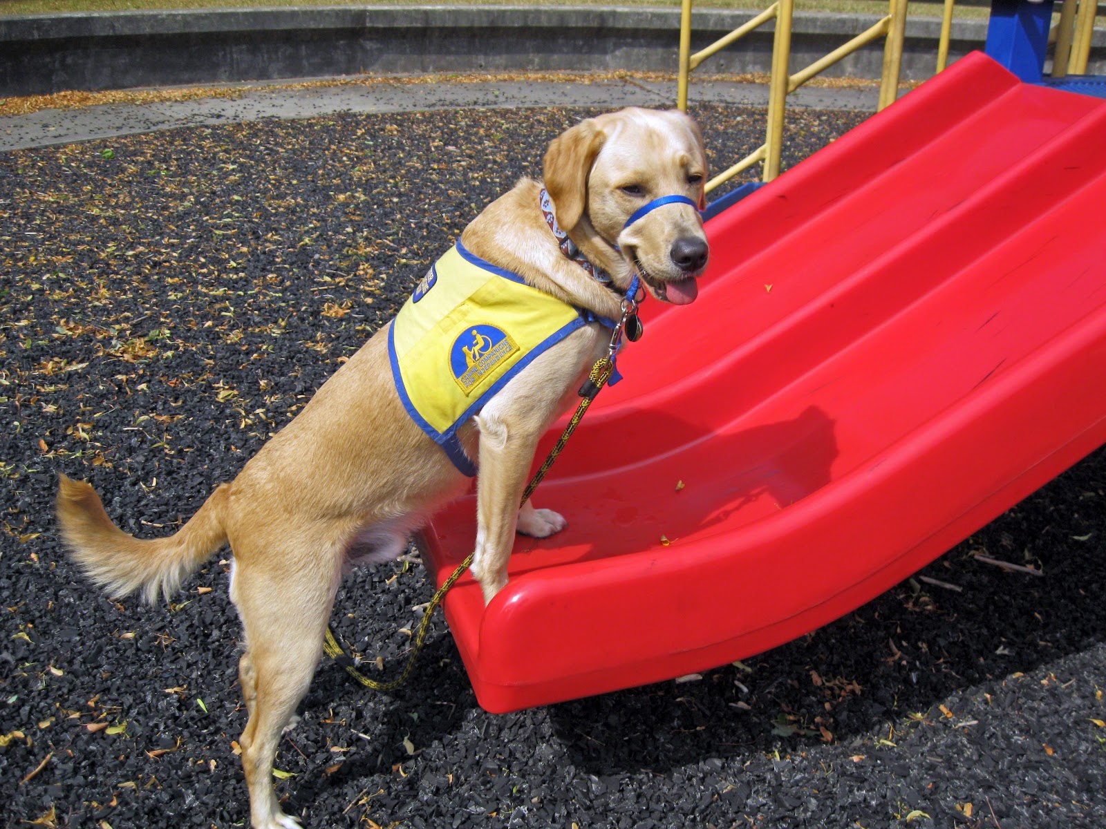 The photo at the top of the post has Everett and Ella in a tube during playtime. As a training exercise we put the pups in a Sit/Stay at one end, then called them through to the other. An enclosed environment is another situation that we want them to be comfortable with. Think about air travel; there’s not much room at the feet of an individual traveling with their service dog by airplane. That’s indeed some tight quarters in the cabin, for both man and beast, so we want the pups to know that it’s still safe when in a space that surrounds their body.