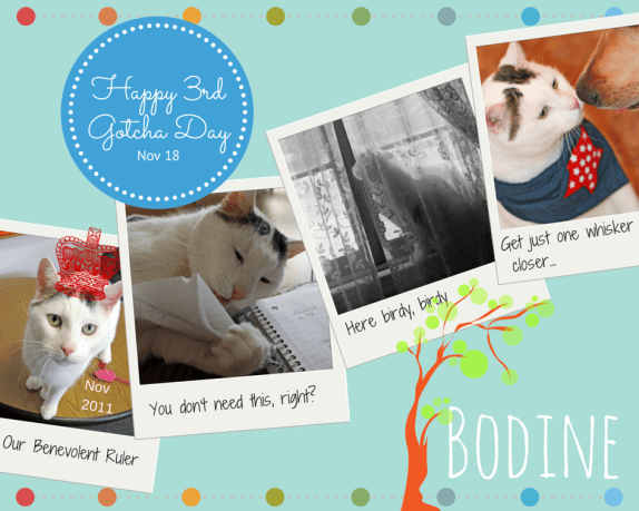 So after I pick up the paperwork Bodine just knocked off the desk, we’ll celebrate his third Gotcha Day with our family.